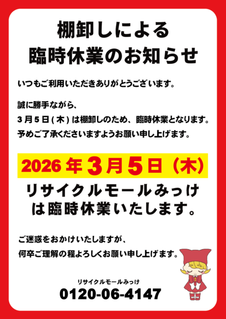誠に勝手ながら、2026/3/5(木)は棚卸しのため、臨時休業となります。